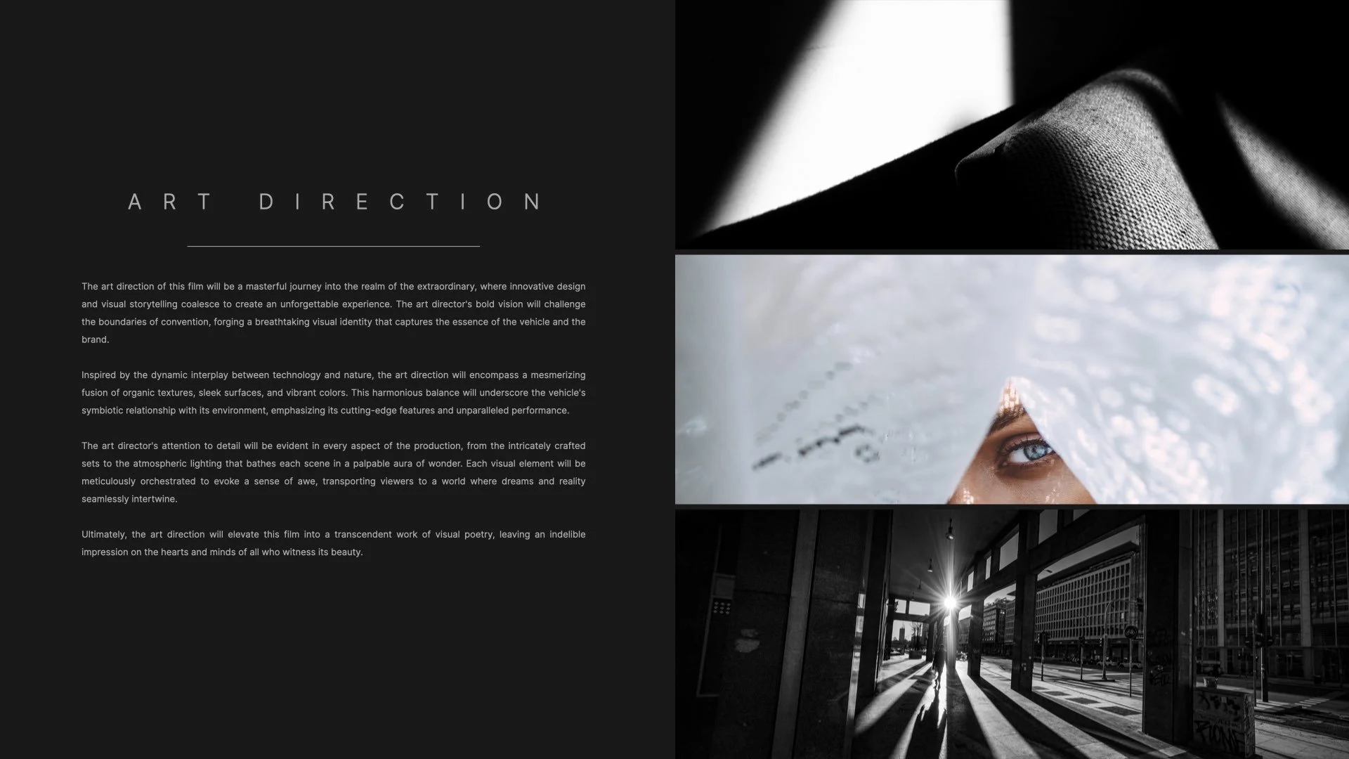 With this purpose-built director’s treatment template, complete with pre-filled text, hand-picked images, and an intuitive drag-and-drop interface, you can create luxury-inspired commercial pitch decks in no time.